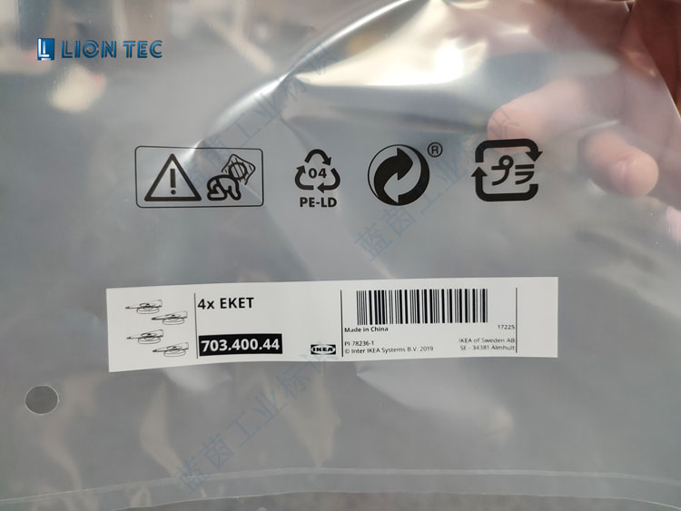 這是宜家家居通過藍(lán)茵UV噴碼機(jī)在PE塑料包裝袋圖案標(biāo)識(shí)、條碼、文本、logo的高清晰打標(biāo)打碼