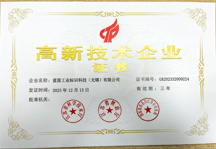 近日,藍(lán)茵工業(yè)標(biāo)識(shí)科技(無錫)有限公司喜獲國(guó)家級(jí)“高新技術(shù)企業(yè)證書”,成為國(guó)家高新技術(shù)企業(yè),并頒發(fā)了證書。此次藍(lán)茵LIONTEC取得的《高新技術(shù)企業(yè)證書》,發(fā)證審批機(jī)關(guān)分別為江蘇省科學(xué)技術(shù)廳、江蘇省財(cái)政廳、國(guó)家稅務(wù)總局江蘇省稅務(wù)局。證書的頒發(fā)充分說明了國(guó)家相關(guān)部門對(duì)藍(lán)茵