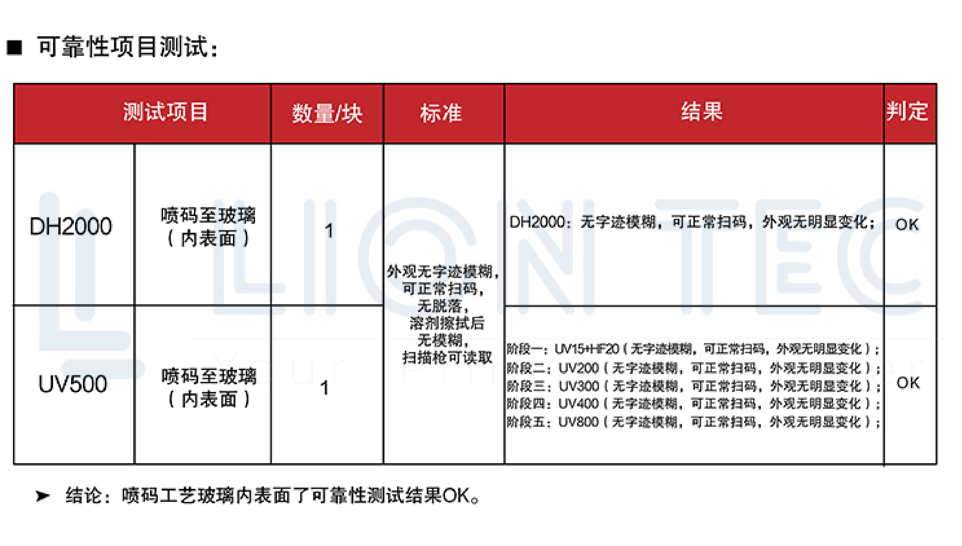 每一塊噴碼玻璃均通過(guò)DH2000濕熱老化試驗(yàn)及UV500紫外耐候試驗(yàn),確保在高濕、高熱、高紫外環(huán)境下仍具備高附著、高識(shí)別度、不脫落、不模糊等性能表現(xiàn)。